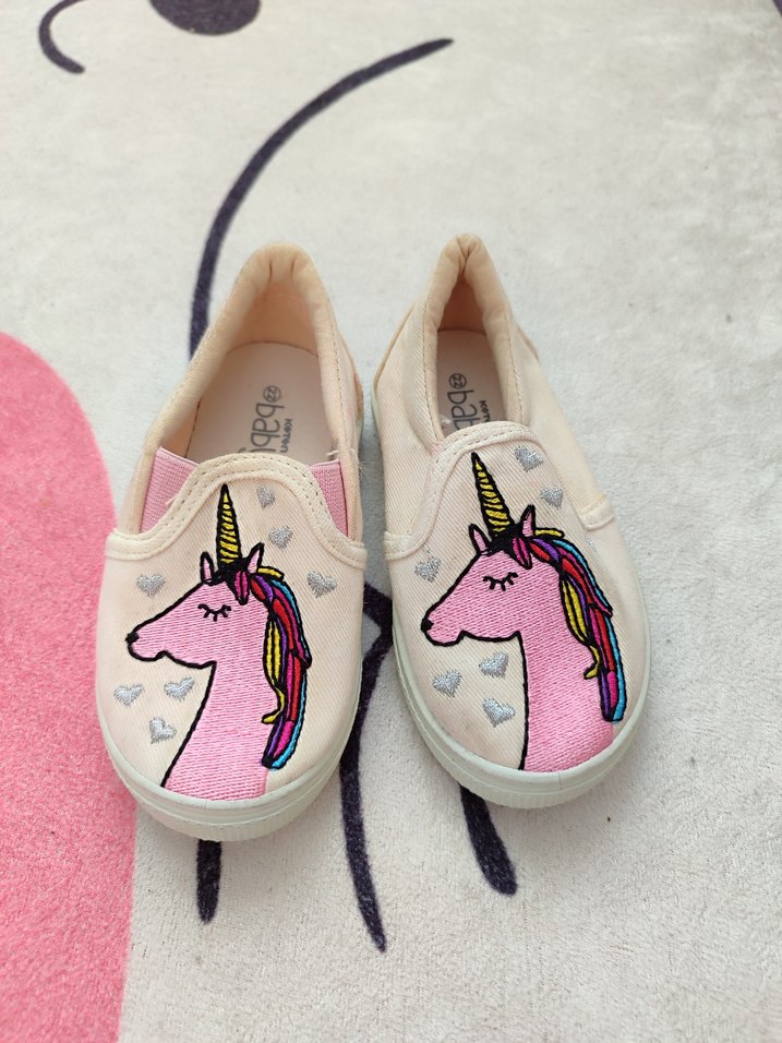 Pembe pastel kız çocuk spor ayakkabılar, nakışlı unicorn desenleri ve cırt cırtlı bantlara sahiptir. Kauçuk tabanlıdır, trend sokak stili için uygundur.