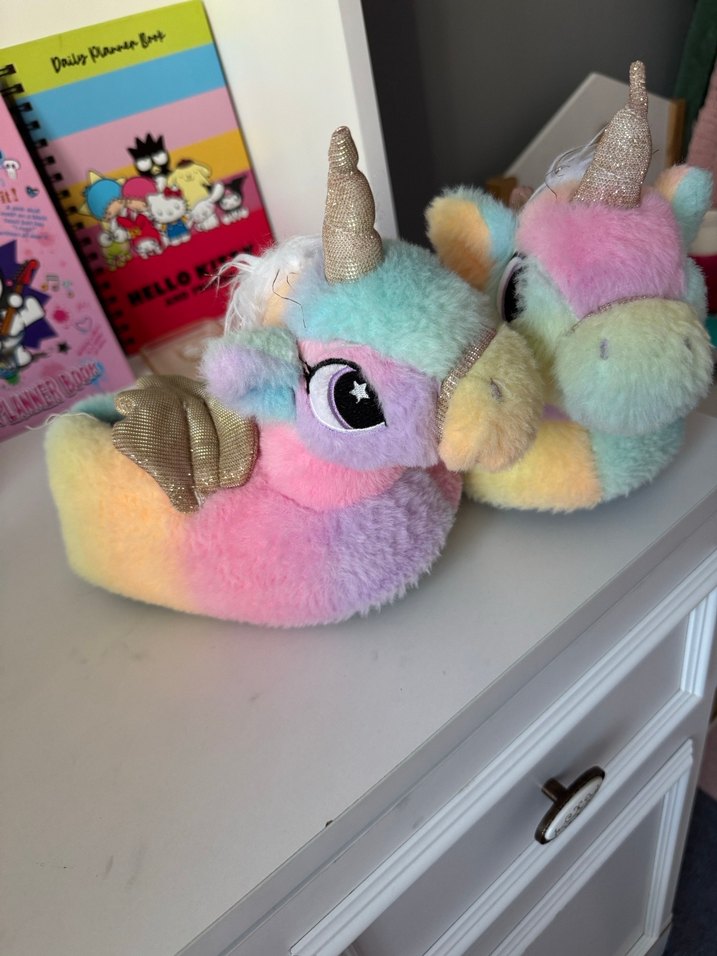 Pastel tonlarda, bağlama desenli, peluş kumaştan yapılmış unicorn tasarımlı, kürklü ve altın renkli boynuz detaylı kız çocuk terlikleridir. Orjinal twgiy marka 28-29 numara hiç kullanılmadı