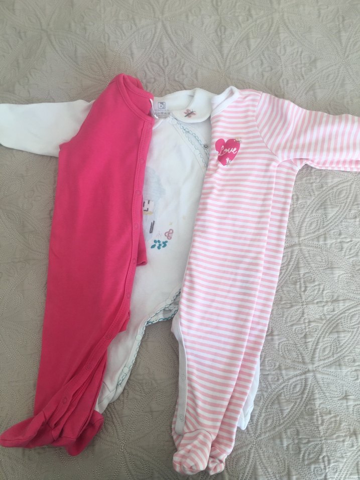 Üç adet uzun kollu kız çocuk tulumu, pastel pembe tonlarında, yumuşak kumaş ve dantel detaylı. Beyaz renk olanda çok hafif lekeler var. 3 tane fiyatıdır.