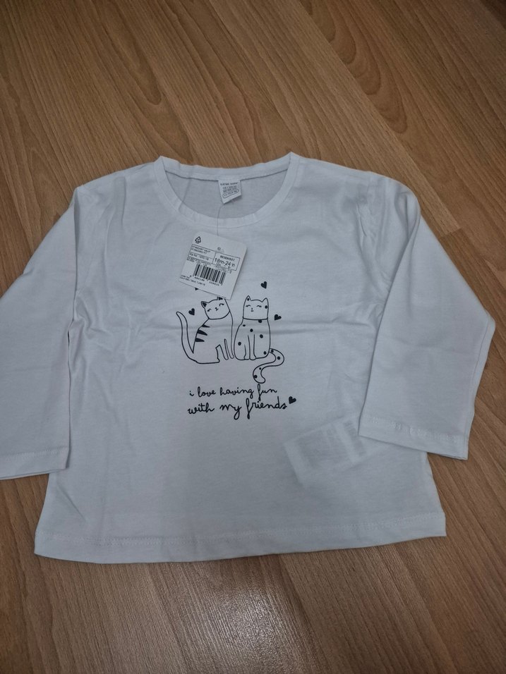 Yumuşak pamuklu kumaştan, bol kesim, uzun kollu ve bisiklet yaka kız çocuk tişörtü. Üzerinde sevimli kedi ve solucan baskısı ile 'I love hanging here with my friends' yazısı bulunur.