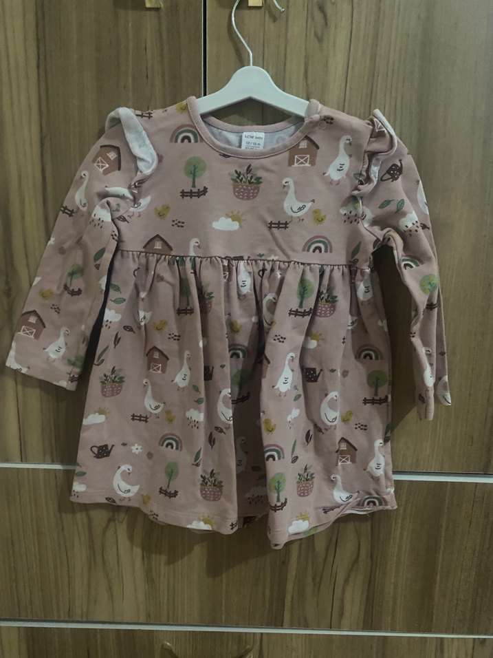 Uzun kollu, bisiklet yaka ve bol kesim kız çocuk elbisesi, pastel kahverengi ve baskılı desenlerle. Fırfır detaylı, yumuşak sentetik kumaştan üretilmiştir.