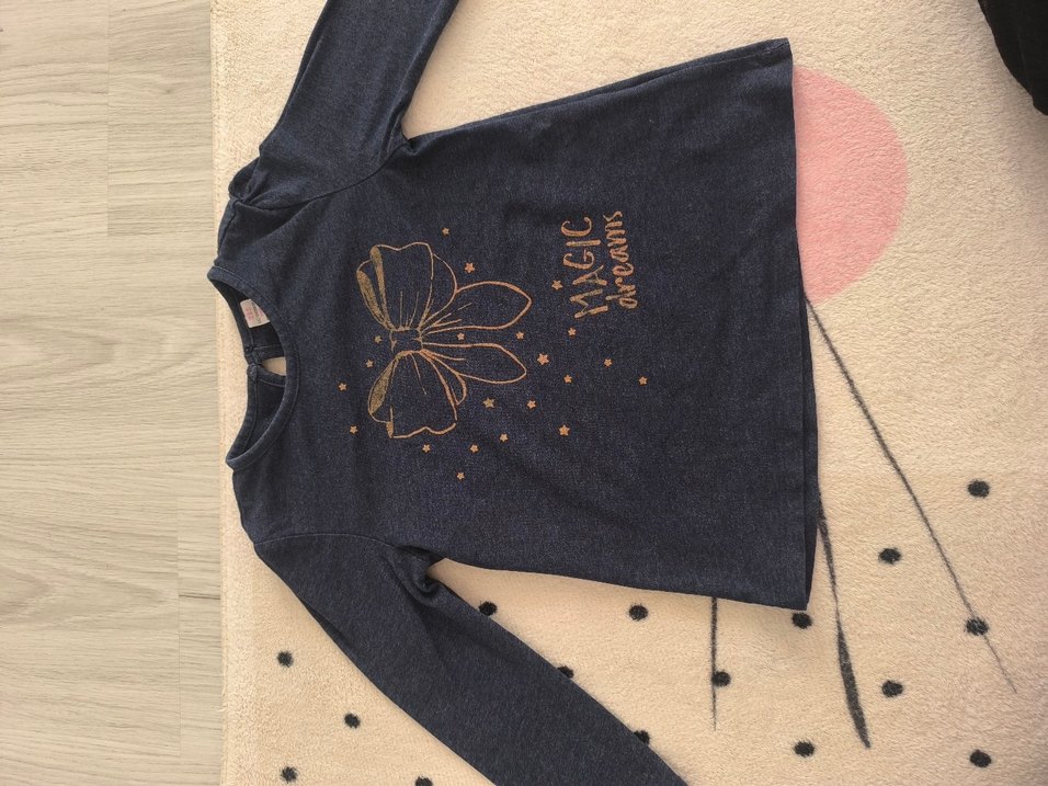 Koyu gri denim kumaştan, uzun kollu, bol kesim kız çocuk tişörtü. Yuvarlak yakalı, sırtında düğmeli ve 'Magic dreams' yazılı baskılı tasarıma sahip. ✨