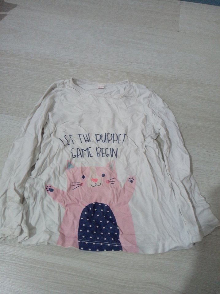 Yumuşak pamuktan, uzun kollu, salaş kesim kız çocuk tişörtü. Bisiklet yakalı, baskılı ve düğmeli detaylı, pastel beyaz renkte.