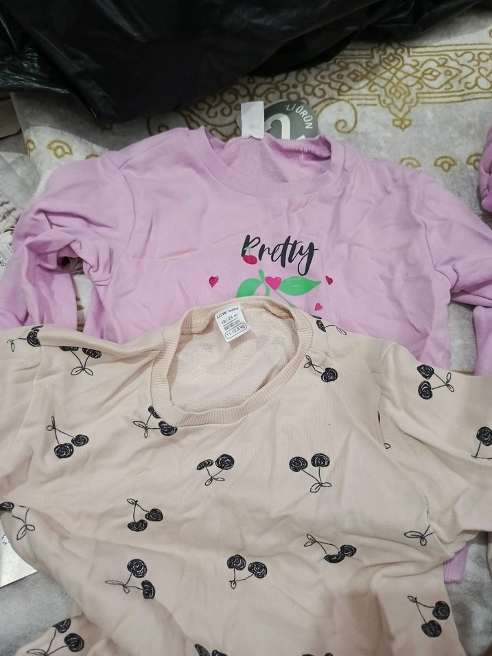 Pamuklu, uzun kollu, yuvarlak yaka kız çocuk tişörtleri. Biri düğmeli, pembe ve 'Pretty' baskılı, diğeri kiraz desenli bej renkte. Rahat ve sokak stili için uygun.