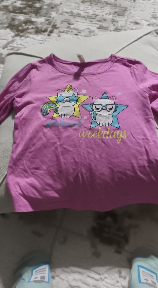 Pamuklu pembe, uzun kollu kız çocuk tişörtü, bol kesim ve yuvarlak yaka. Omuzda düğme detayı ve renkli yıldızlar içinde kedi baskısı bulunur.