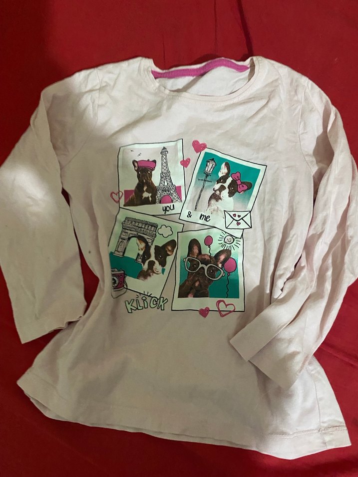Pamuk kumaştan yapılmış, salaş kesim ve bisiklet yaka özellikli, pembe uzun kollu kız çocuk tişörtü. Üzerinde baskılı köpek desenleri bulunur.