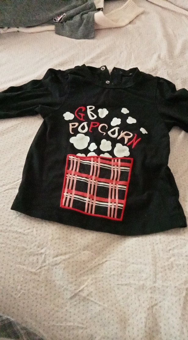 Siyah, uzun kollu, bol kesim kız çocuk tişörtü. Düğmeli, bisiklet yaka ve patlamış mısır baskılı, yumuşak ve sıcak kumaştan.