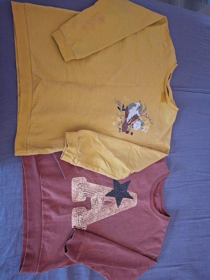 Sentetik kumaştan, bol kesim, uzun kollu kız çocuk sweatshirts. Biri çiçek baskılı, diğeri pul işlemeli yıldız ve harf detaylı, cırt cırtlı.