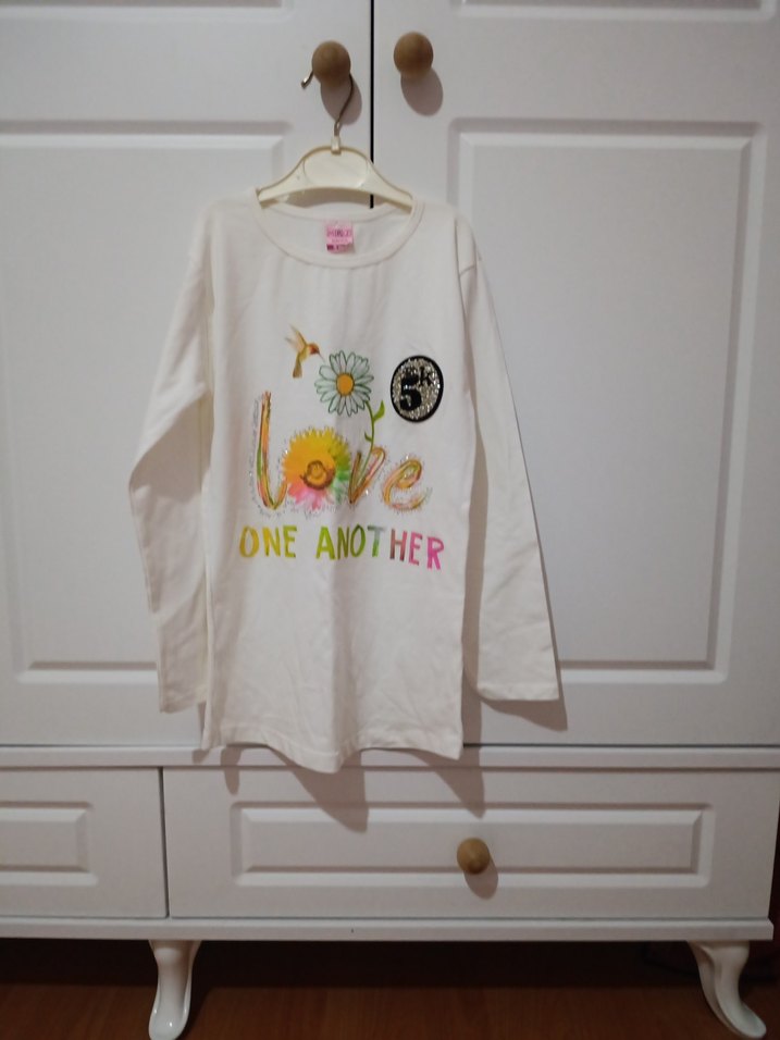 Beyaz uzun kollu kız çocuk tişörtü, dar kesim ve baskılı çiçek desenlidir. Düğme detaylı ve yuvarlak yakaya sahiptir.hiç kullanılmadı