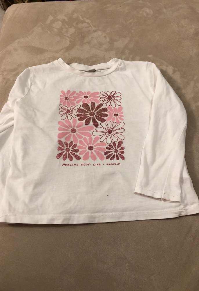 Kız çocukları için uzun kollu, bol kesim ve bisiklet yaka tişört. Yumuşak ve sıcak kumaştan, pastel beyaz renkte, önünde baskılı çiçek deseni bulunur. Kullanıma bağlı hafif deformasyon var kolunda fakat temizdir yıkanmış ve ütülüdür.Park-sokak için makul ürün.