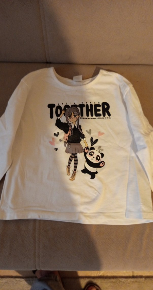 Pamuklu beyaz uzun kollu tişört, bol kesim ve yuvarlak yaka. Üzerinde kız ve panda baskısı ile "TOSATHER" yazısı bulunur. Trend sokak stili için uygundur.
