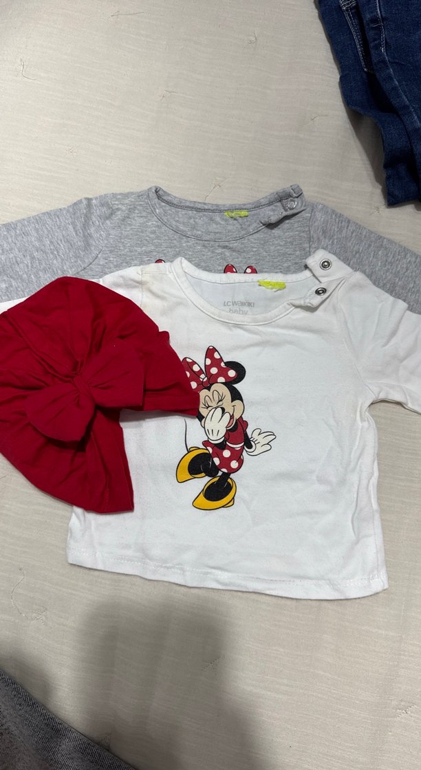 Pamuk kumaştan, uzun kollu, bisiklet yaka ve düğmeli omuz detaylı kız çocuk tişörtü. Minnie Mouse baskısı ve süslü fiyonk ile sade ve şık.beyaz bluz da hafif lekeler vardır