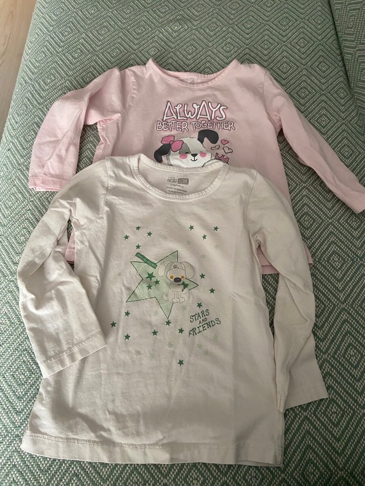 İki pastel pembe uzun kollu pamuklu kız çocuk tişörtü, bol kesim ve baskılı eğlenceli desenlere sahiptir. Rahat yuvarlak yaka, günlük kullanım için uygundur.