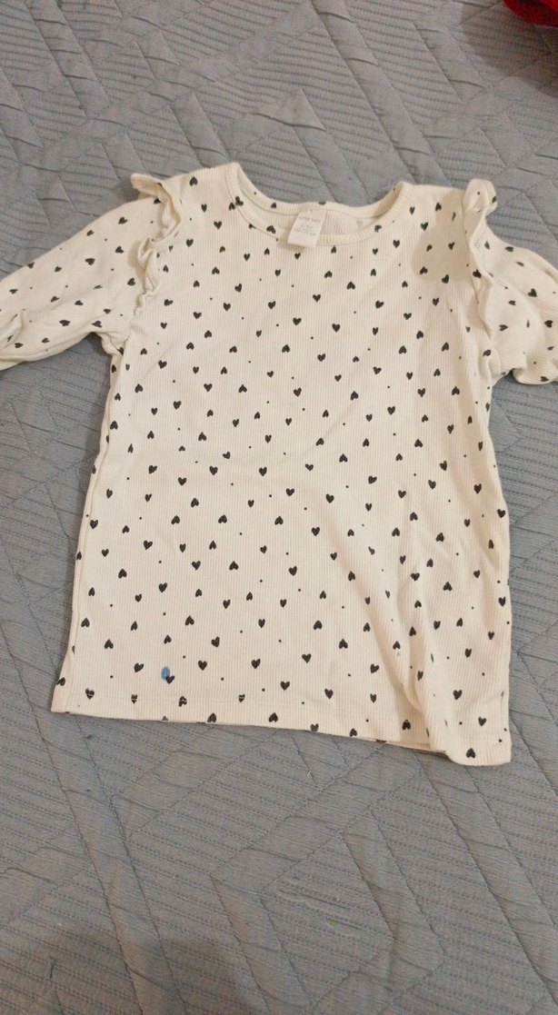 Kız çocukları için uzun kollu, yuvarlak yakalı pamuklu bluz. Bol kesim, düğme detayı ve küçük kalp desenleriyle sade bir tasarım. ❤️