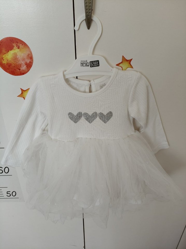 Kız çocuklar için uzun kollu, bisiklet yaka ve göğsünde nakışlı kalpler bulunan beyaz elbise. Pamuklu kumaşı yumuşak, etek kısmı fırfırlı tül ile detaylandırılmıştır.