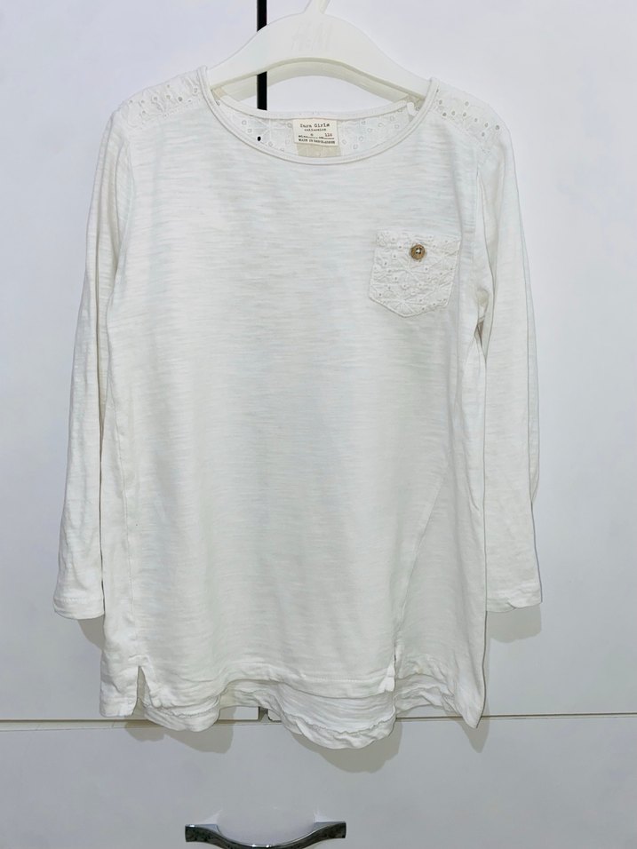 Keten kumaştan, uzun kollu, yuvarlak yakalı ve düğmeli cep detaylı beyaz, bol kesim kız çocuk tişörtü. Fisto detaylı kızçocuk bluz. Yırtık sökük leke yok. Orijinal mağaza ürünü.#kızçocukbluz #zarabluz #kızçocukbluz #fistobluz