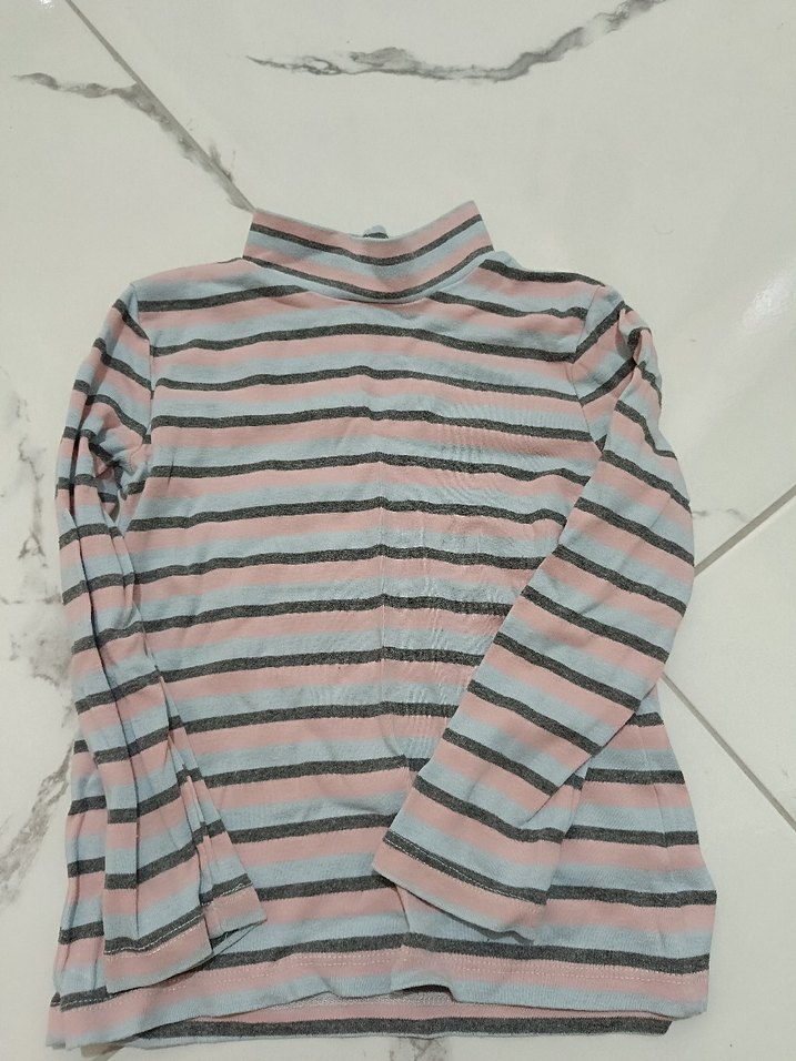Kız çocuklar için uzun kollu, boğazlı ve triko dokulu tişört. Pastel pembe ve gri çizgili, sentetik kumaştan yapılmış, trend sokak stili için uygun.