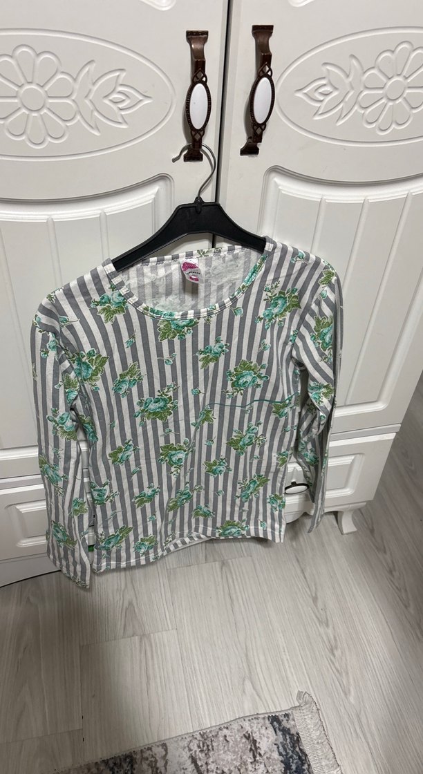Gri ve yeşil renklerde çizgili ve çiçek desenli, yuvarlak yakalı, ince örgü dokulu kız çocuk uzun kollu bol kesim bluz. Sokak stili için uygundur.