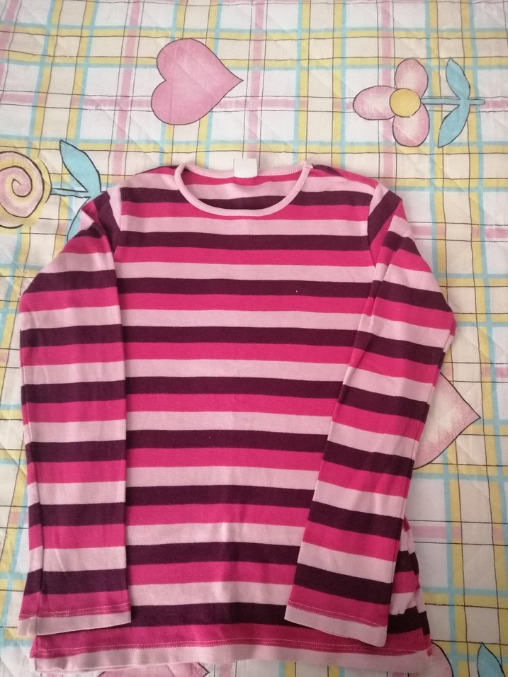 Kız çocukları için uzun kollu, renkli çizgili, yuvarlak yakalı, sıkı kesim triko tişört. Yumuşak sentetik kumaştan örülmüştür.