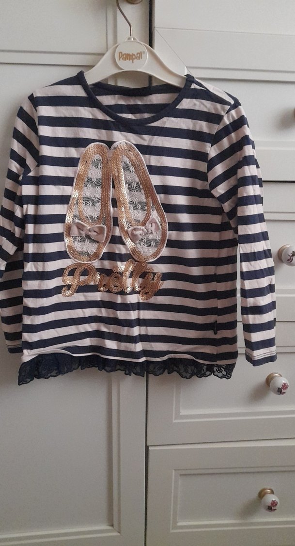 Kız çocukları için uzun kollu, bol kesim ve yuvarlak yaka tişört. Alt kısmında dantel detayları vardır. Çizgili desenli, üzerinde bale ayakkabısı ve "Pretty" baskısı bulunur