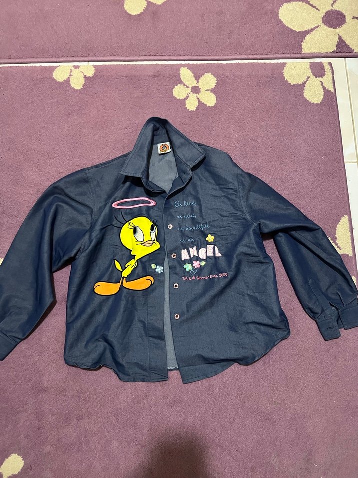 Kız çocukları için koyu mavi renkte, uzun kollu ve bol kesim denim gömlek. Düğmeli, yakası kesik ve baskılı Tweety figürlü, trend sokak stili için uygundur.