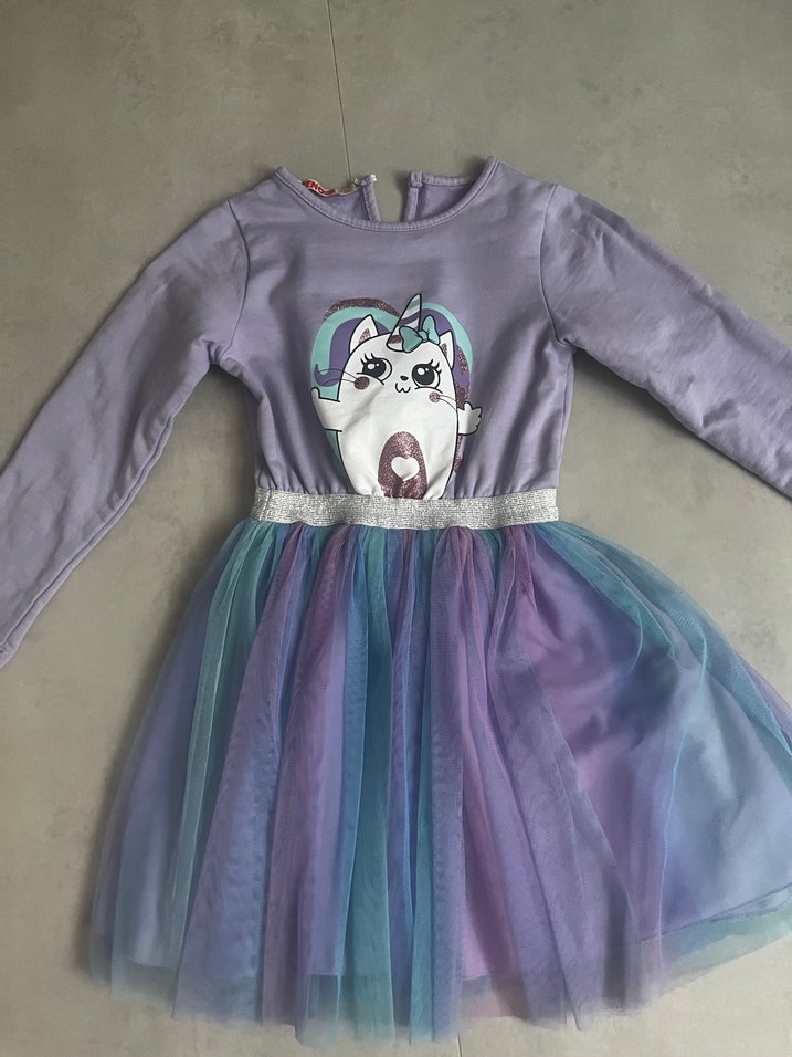 Fitted kesim mor elbise, uzun kollu ve yuvarlak yakalıdır. Önünde sevimli bir unicorn baskısı bulunur. Pastel tonlarda, fırfırlı ve yumuşak kumaştan yapılmış etek kısmı vardır. Kullanımı çok rahat iyi durumda