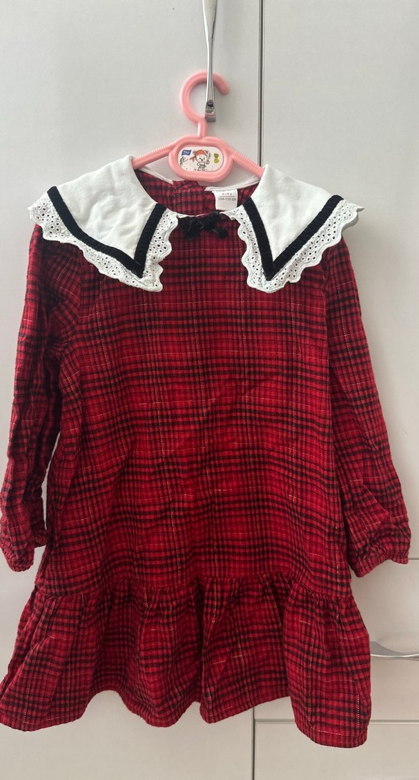 Bu kız çocuk elbisesi uzun kollu ve bol kesimdir. Koyu kırmızı kareli desene, büyük beyaz dantelli yakaya ve fırfırlı eteğe sahiptir. Sentetik kumaştandır. 3-4 yaş giyer