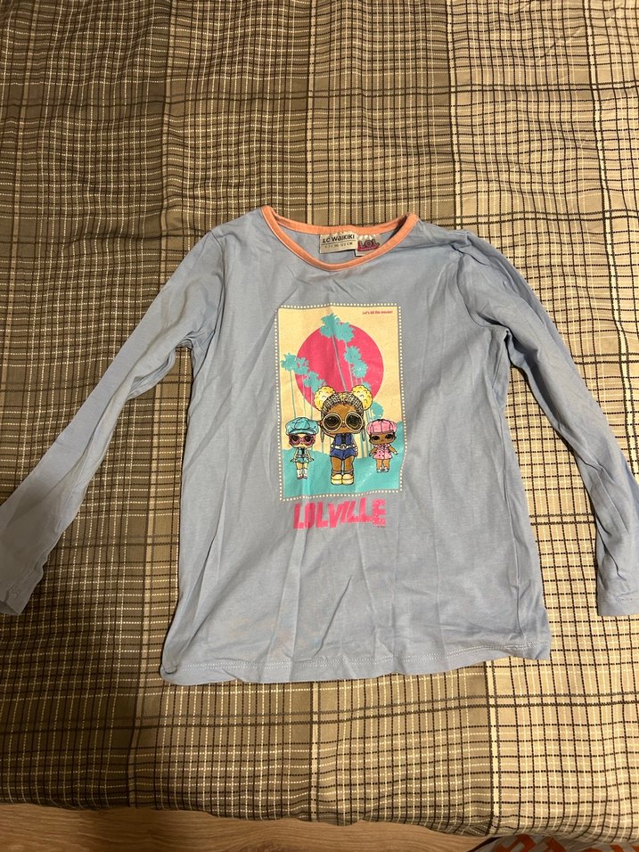 4 adet, tane 220. Bol kesim, uzun kollu gri kız çocuk tişörtü, yuvarlak yaka ve düğmeli omuz detayına sahiptir. Canlı pop kültür baskısı ve yumuşak kumaş kullanılmıştır. "LOLVILE" yazılıdır.