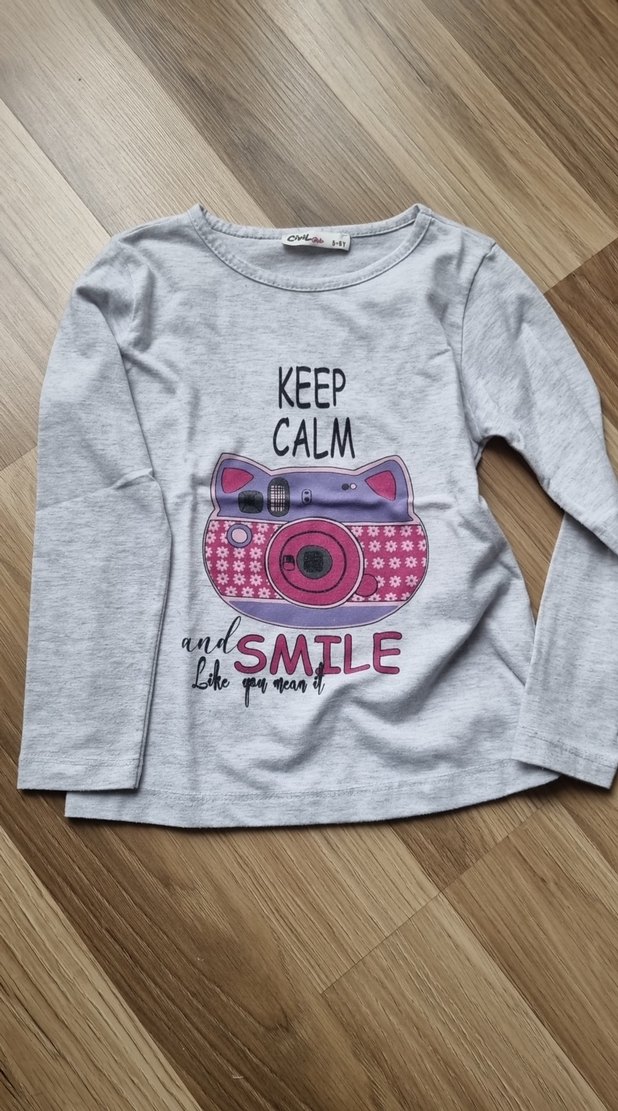 Kız çocukları için uzun kollu, yuvarlak yaka, bol kesim gri tişört. fotoğraf makinesi ve 'KEEP CALM SMILE' yazısı bulunur. hic bir sorunu yoktur 5-6 yaş için uygundur.