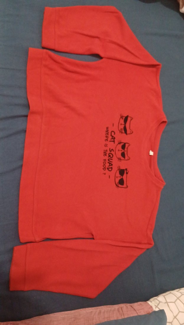 Renkli kırmızı uzun kollu kız çocuk tişörtü, bol kesim ve sevimli baskılı kedi figürüyle, yumuşak ve sıcak kumaştan üretilmiştir.