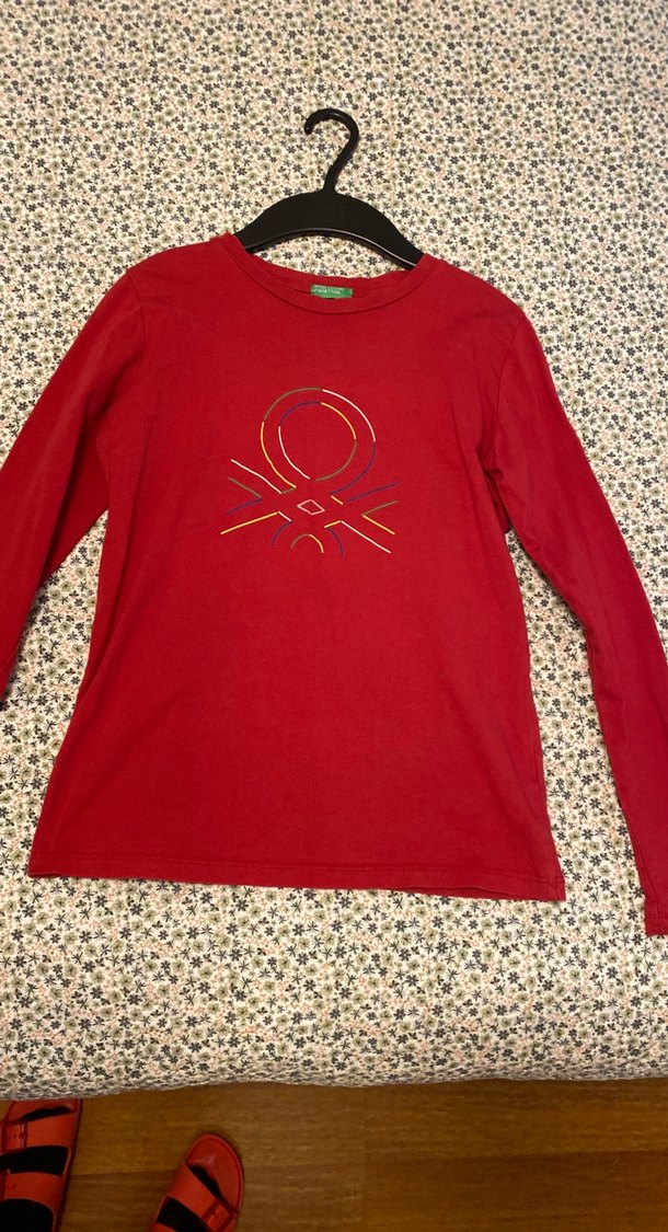 Kız çocukları için uzun kollu, kırmızı, renkli baskılı ve rahat kesimli sentetik kumaştan tişört. Sokak modasına uygun rahat tarz sunar.