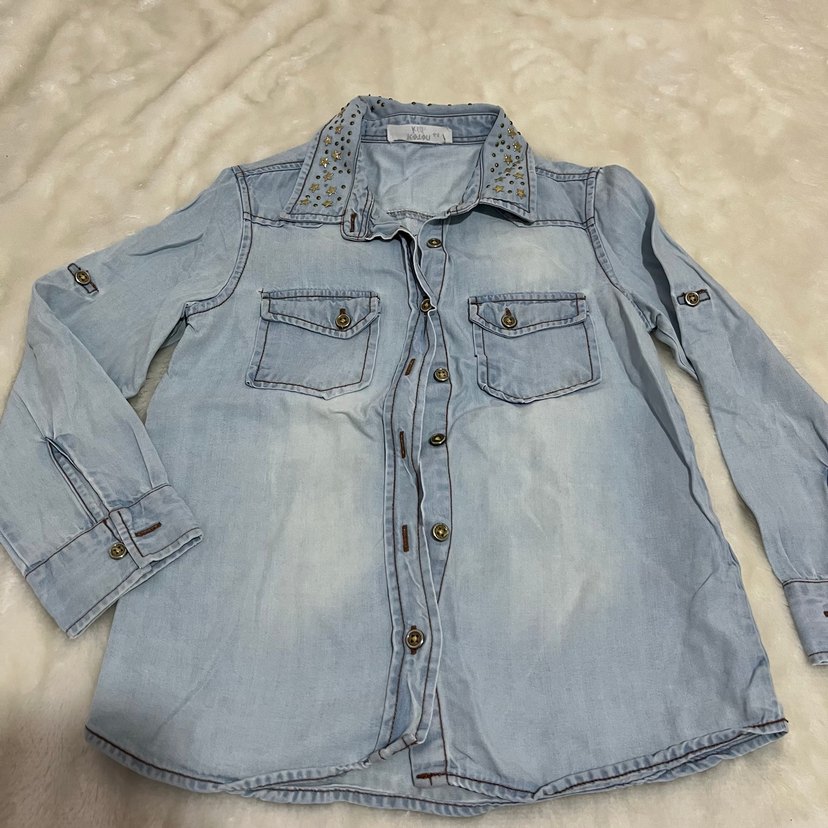 Mavi renkli, düğmeli cep detaylı, yakasında parlak taş süslemeleri bulunan uzun kollu bol kesim denim gömlek. Günlük rahat stil için uygundur.