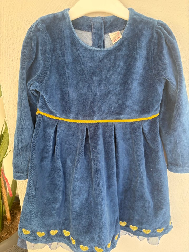 Uzun kollu, yuvarlak yaka mavi kız çocuk elbisesi, yumuşak dokulu kumaş ve pileli tasarımla sarı kalp detaylarına sahip.