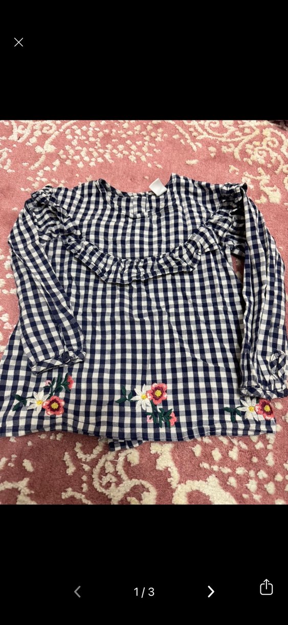 Kız çocuk için uzun kollu, fırfırlı ve nakışlı çiçek detaylı koyu kareli pamuklu bluz. Bol kesim ve kayık yaka, bohem ve retro tarzını yansıtır. 4/5 yaş