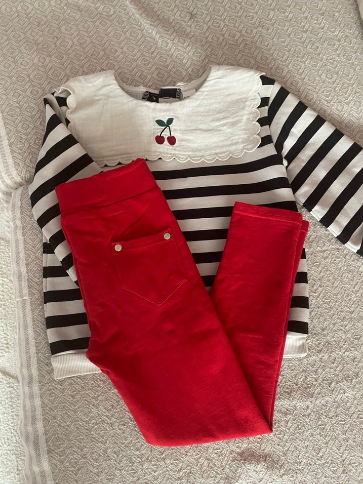 Kız bebek için uzun kollu, nakışlı kiraz detaylı triko üst ve canlı kırmızı pantolon takımı.