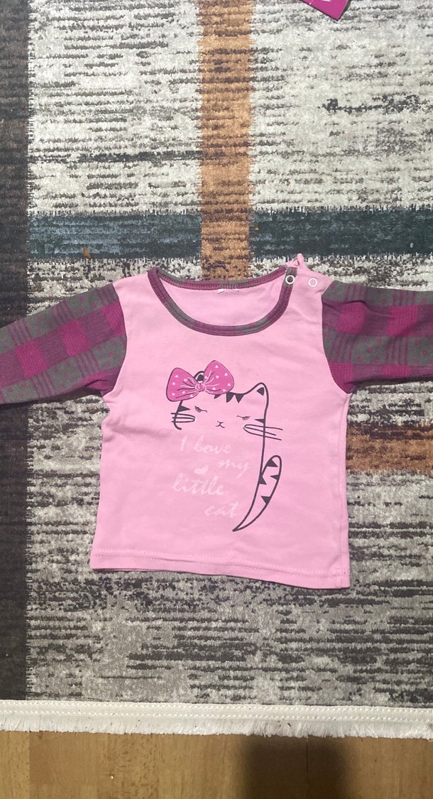 Rahat kesim, uzun örme kollu, pembe gövde üzerine baskılı kedi figürü ve bisiklet yaka detaylı kız çocuk tişörtü.