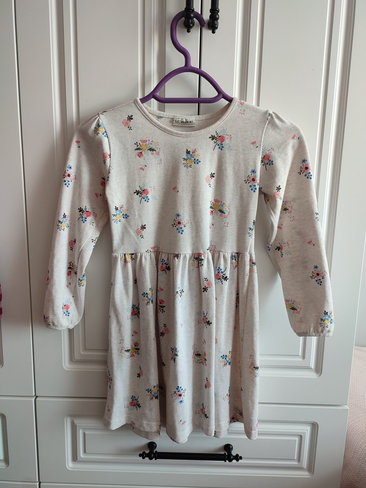 Kız çocuk elbisesi, uzun kollu ve yuvarlak yakalıdır. Pamuklu, hafif beyaz renkte, çiçekli desenli ve pileli bel detayına sahiptir.