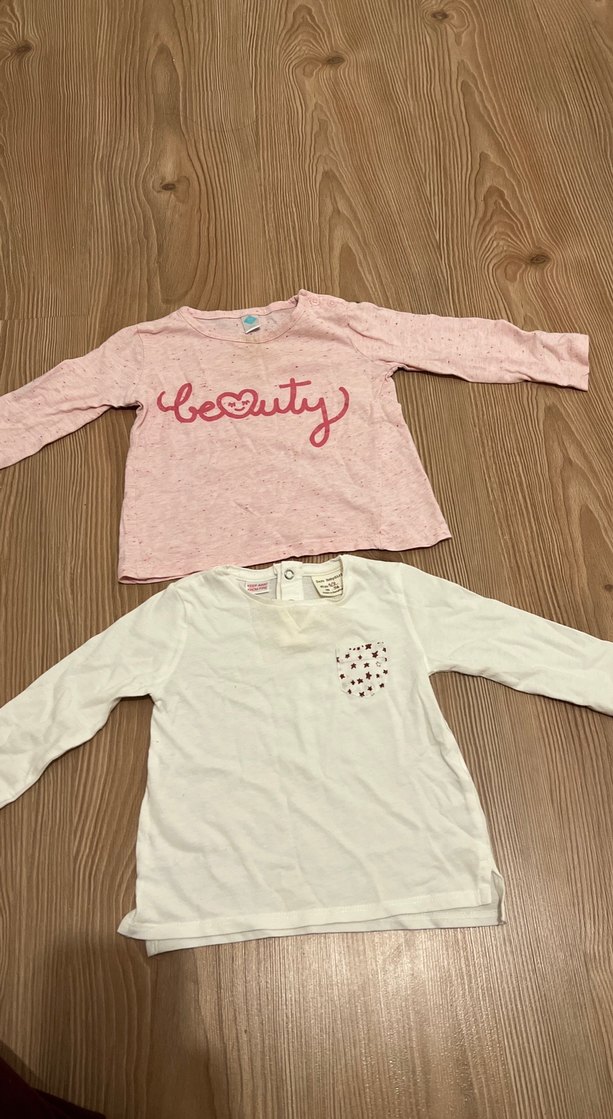 Kız çocukları için pamuklu, uzun kollu tişörtler. Biri dantel detaylı pembe ve "beauty" baskılı, diğeri beyaz ve küçük baskılı cep detaylıdır. Rahat kesimlidir.