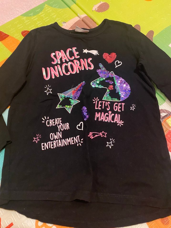 Uzun kollu yuvarlak yakalı tişört. Canlı renkli, ışıltılı unicorn ve yıldız payetleri var