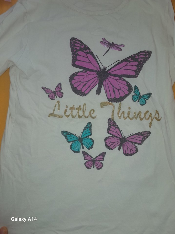 Uzun kollu, kelebek baskılı ve sim detaylı, mor ve mavi tonlarında kız çocuk tişörtü. yuvarlak yakaya sahiptir.
