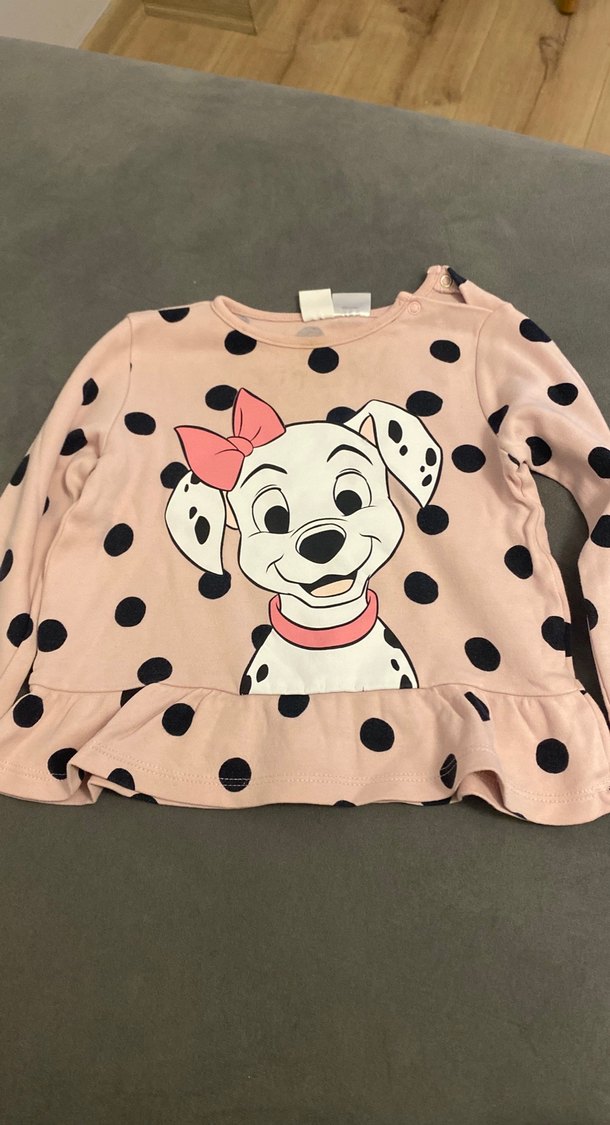 Pamuk kumaştan yapılmış, uzun kollu, yuvarlak yakalı, bol kesim kız çocuk tişörtü. Pastel pembe renkli, siyah puantiyeli ve fiyonk detaylı Dalmaçyalı baskılıdır.