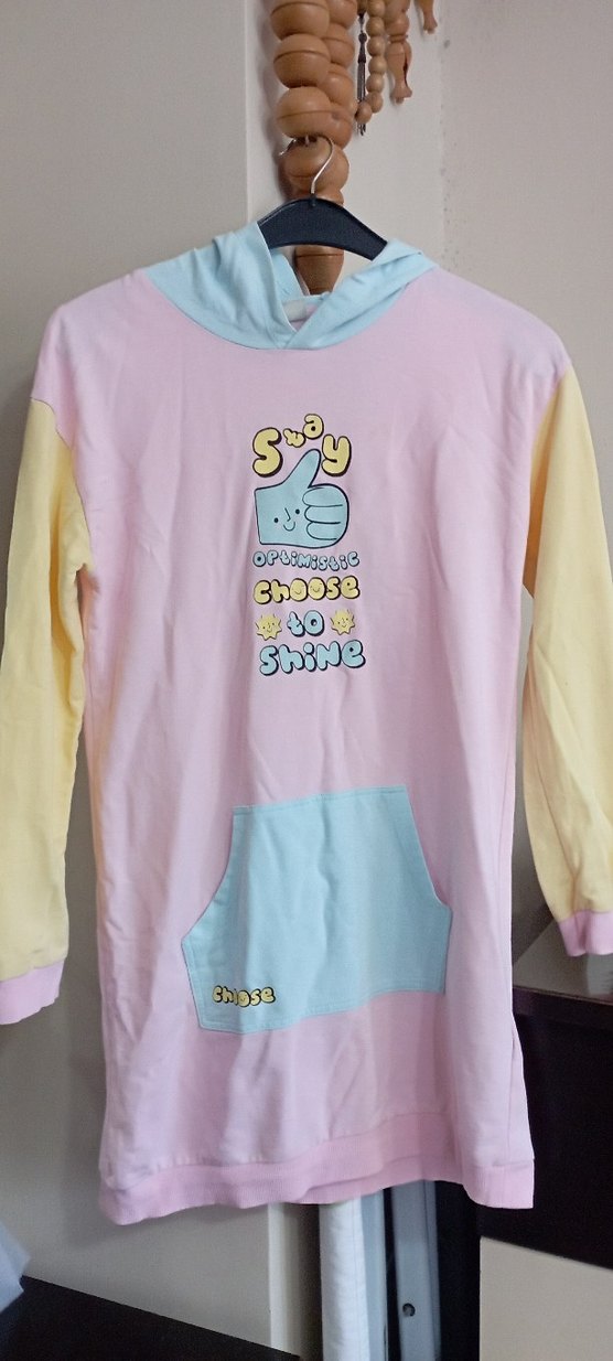 Kız çocuk sweatshirt uzun kollu, yuvarlak yaka ve bol kesimdir. Pembe, sarı ve açık mavi pastel renklerde, baskılı desenli ve ön ceplidir. Kapüşonlu ve düğmeli detaylıdır.