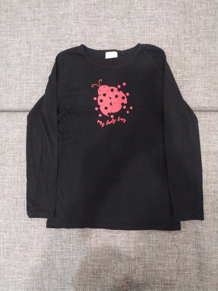 Siyah, uzun kollu, bol kesim kız tişörtü. Önünde kırmızı baskılı uğur böceği ve düğme detayları bulunur. Yumuşak sentetik kumaşlı.