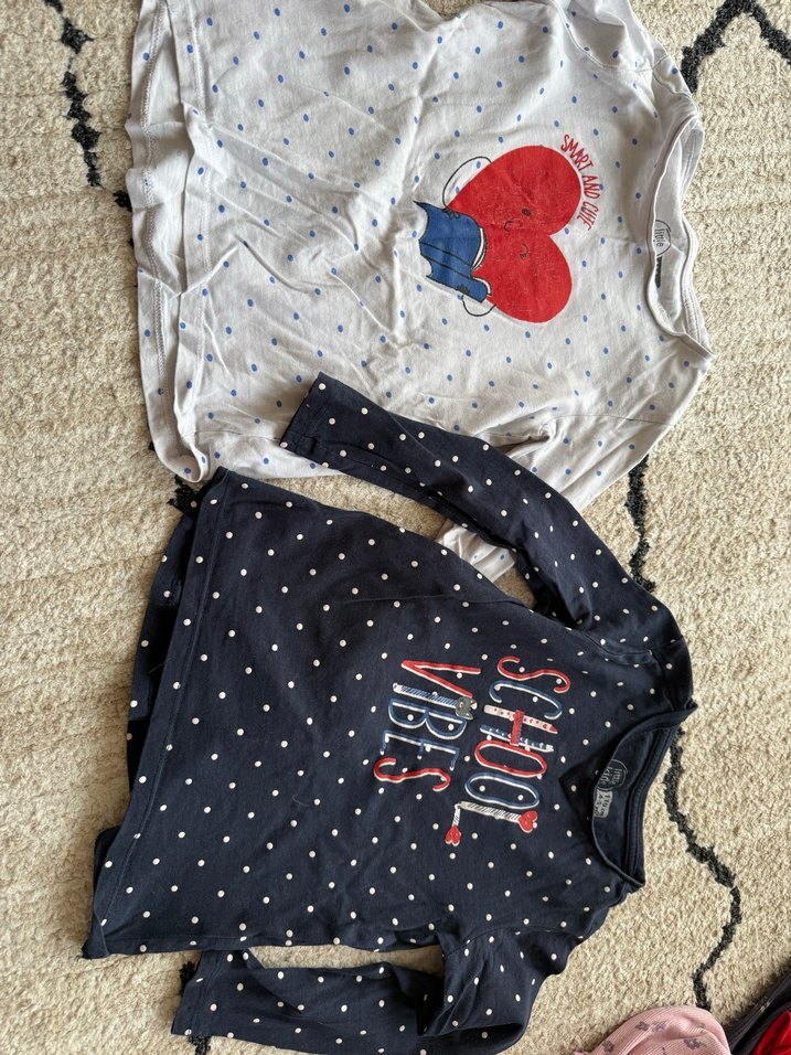 Kız çocukları için uzun kollu, nakışlı ve örgü detaylı tişörtler. Gri tişört kalp desenli, koyu renkli tişört puantiyeli ve 'School Vibes' yazılı. Yuvarlak yaka, sokak stili. 4-5 yaş yıkanmaya bağlı renk değişimi var
