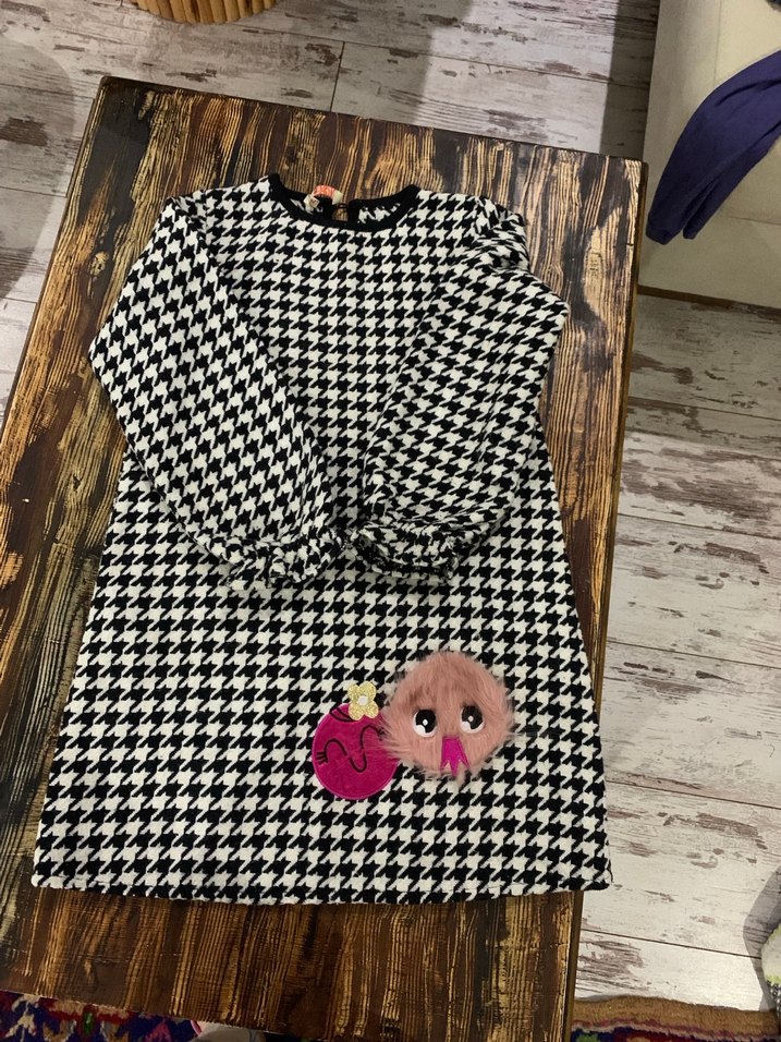 Kız çocuk için bol kesim, uzun kollu ve bisiklet yaka triko elbise. Nakış ve eğlenceli aplikelerle süslenmiş, koyu renklerde sokak tarzı elbise.