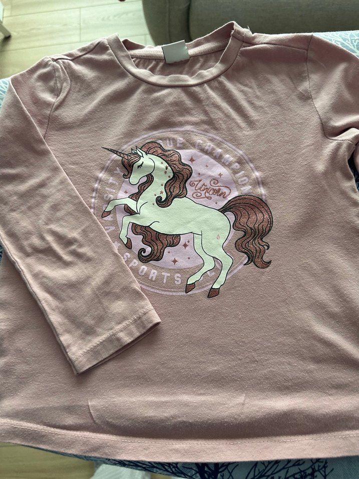 Pamuklu, uzun kollu, pastel pembe renkli, unicorn baskılı, yuvarlak yakalı, rahat kesim kız çocuk tişörtü.