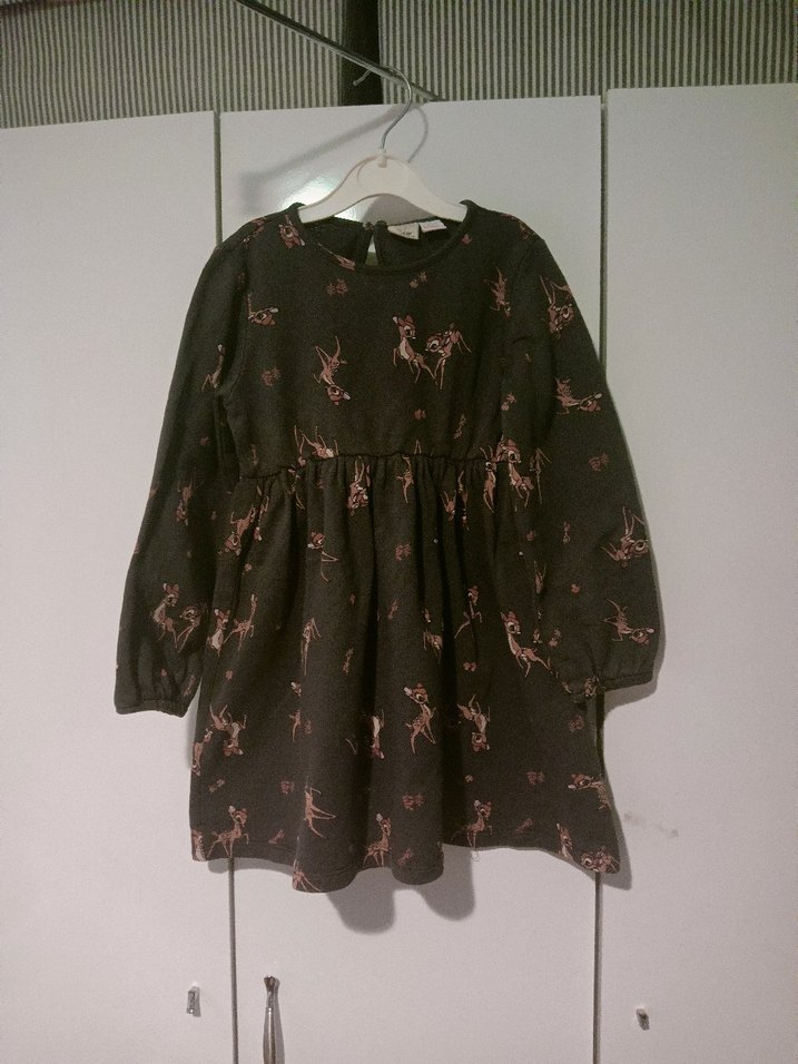 Koyu ren kız çocuk elbisesi, uzun kollu ve bol kesimdir. Yumuşak polar kumaştan örme dokulu ve desenlidir.