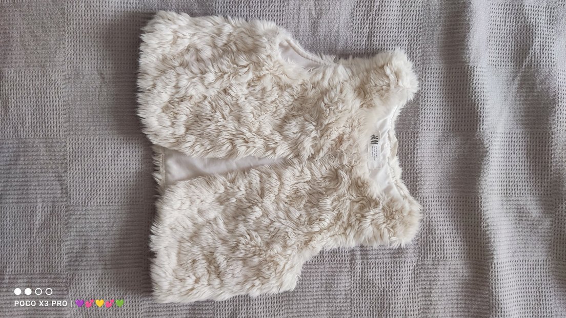 Bej renkte, yumuşak kürk detaylı, kolsuz ve v yaka kız çocuk yeleği. Düz ve bohem tarzda, sıcak tutan yumuşak kumaştan yapılmıştır.