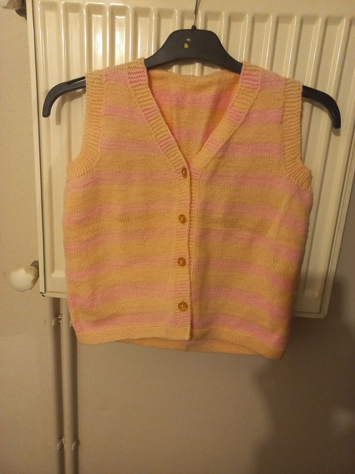 Kız çocuklar için örme süveter, V yaka ve bol kesim özelliklerine sahiptir.pastel tonlarında çizgili deseni ve düğmeli kapaması bulunur. iki koltuk arası 39cm boy 44cm