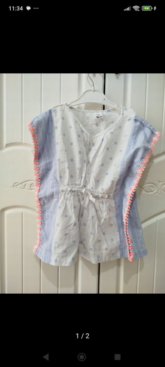 Pamuklu, kolsuz, bol kesim kız çocuk pareo. V yaka ve yanlarda püskül detayları bulunur. Pastel tonlarda batik desenli, bohem tarzda bir modeldir. Çok çok temizdir. Bir kere kullandım. 4 5 yaş